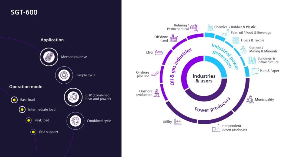 High reliability, excellent fuel flexibility and third-generation DLE make the SGT-600 a perfect choice for applications like industrial power generation in combined heat and power (CHP), and combined circle power plants (CCPP), onshore oil and gas power generation, as well as mechanical drives.